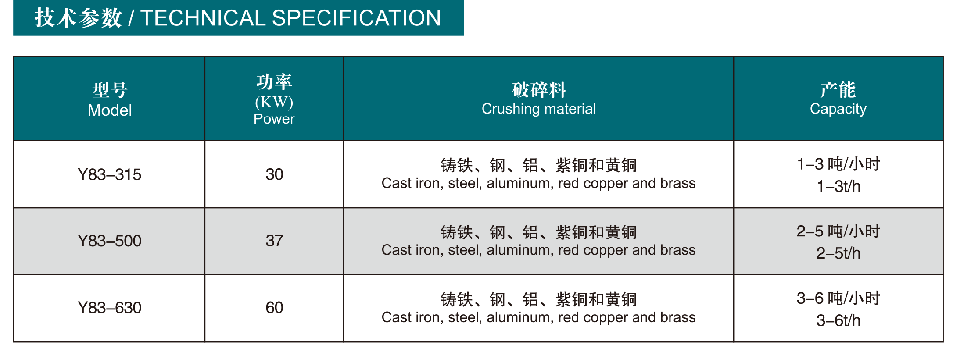 本公司生產(chǎn)的Y83系列立式壓餅機(jī)和臥式雙主缸壓餅機(jī)是為加工處理大量破碎料的高性能機(jī)器, 破碎料包括鑄鐵、鋼、鋁、紫銅和黃銅, 另外, 也可以處理研磨漿與金屬碎屑的混合物。